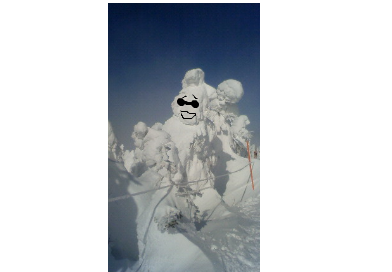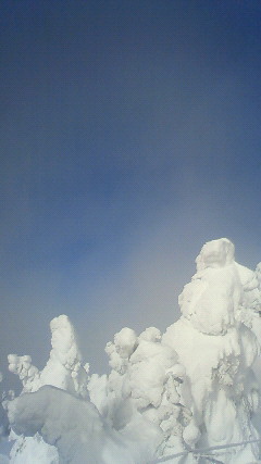 ほんの一瞬だけ視界が開け快晴になり現れた樹氷。
